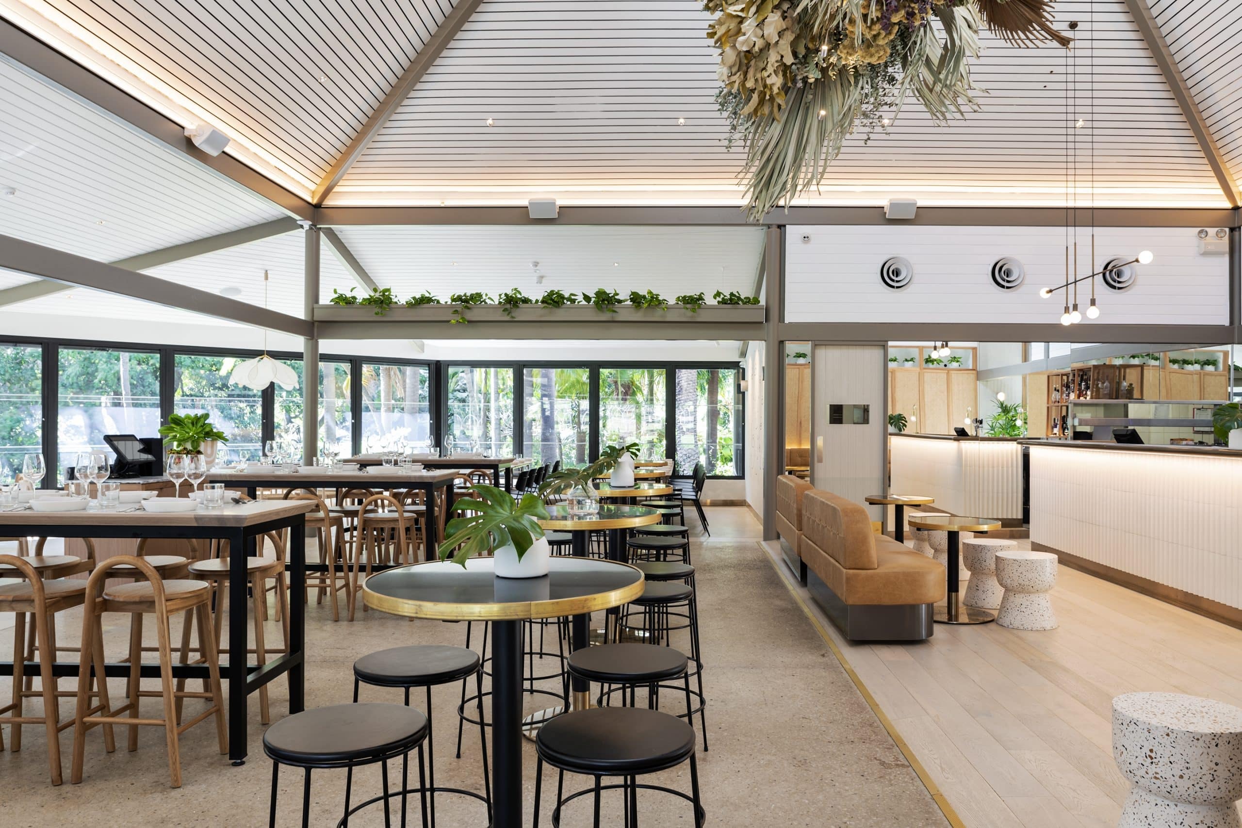 Botanic House is located on the upper level of this modern, two-story function venue. Nestled in amongst the foliage, this venue offers visitors a tranquil but stylish space to enjoy world-class dining, Sydney Harbour views and barista-made coffee. It has high ceilings, a neutral colour palette, an open plan design, avant-garde furniture and sleek, stylish finishings.