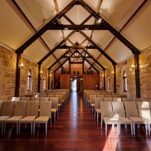Built with hand-cut sandstone, the Carriage House is an intimate space seating up to 120 guests. Encircled by magnificent gum trees, it makes a gorgeous backdrop for photos.
