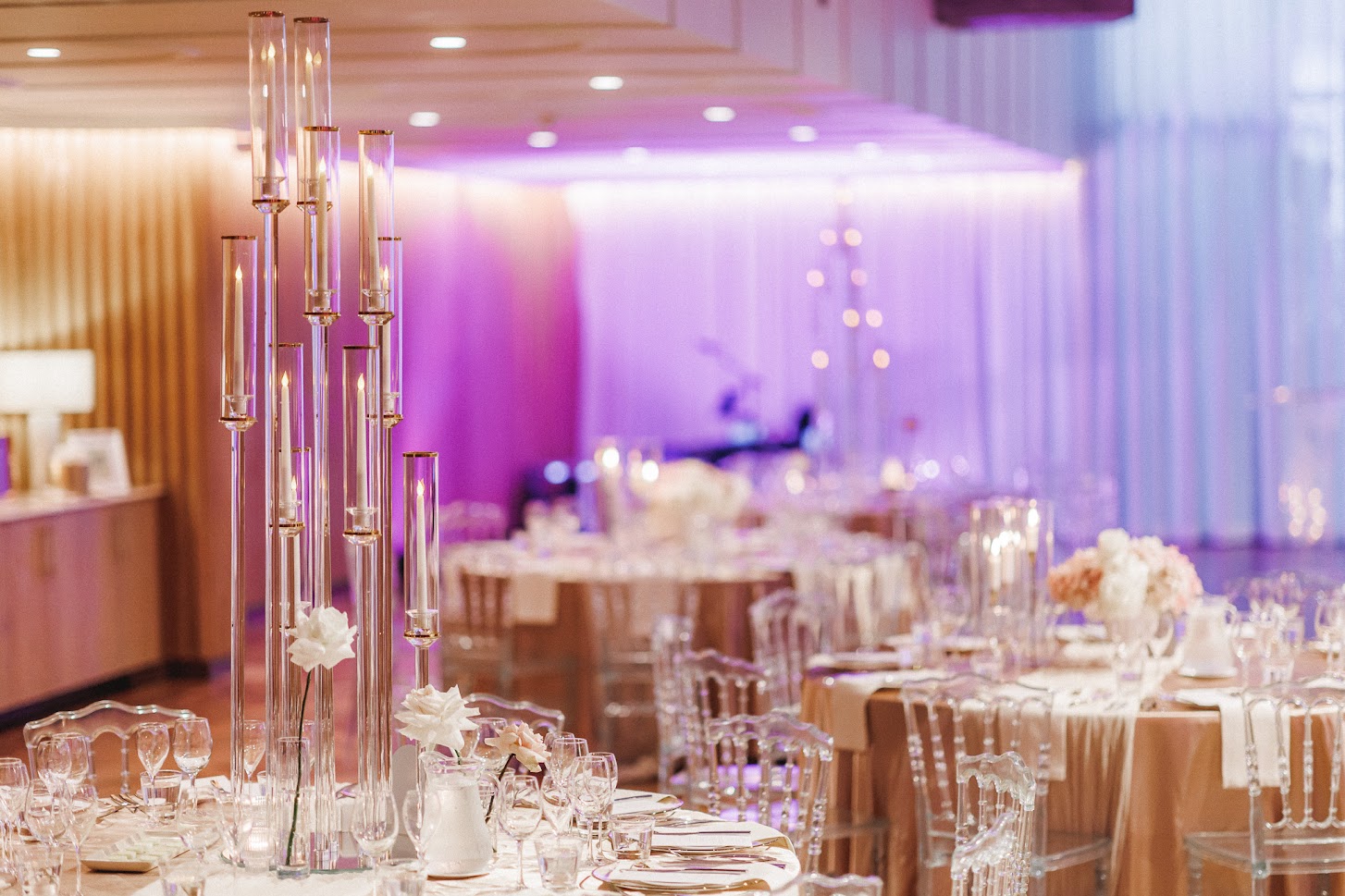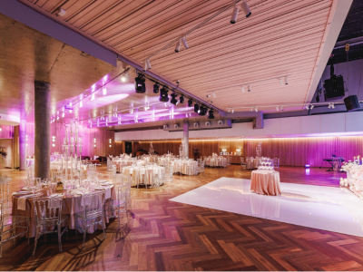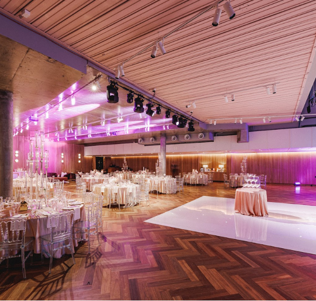 This ornate wedding space is brimming with classic elegance and features wood-panelled walls, intricate glass chandeliers, herringbone flooring, an outdoor balcony, and a beautiful whisky bar. The Heritage Room has space for up to 90 seated guests or 200 guests for cocktail-style weddings.
