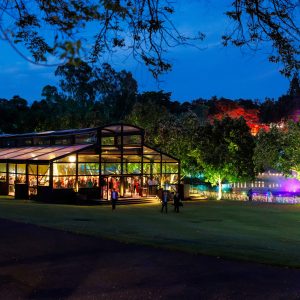 Corporate events at Glo House feel immersive and design-led, set within a striking glass pavilion that blends natural surroundings with high-end production, creating an engaging and memorable atmosphere.