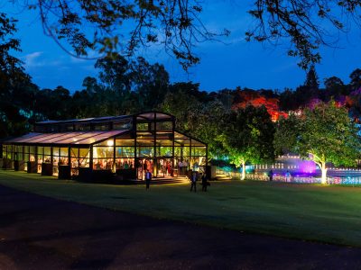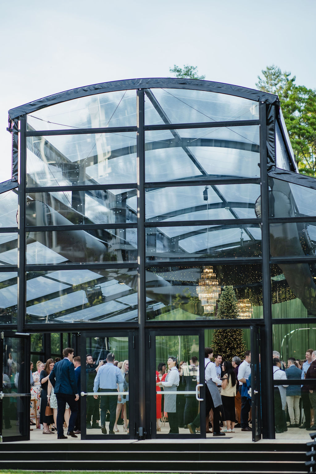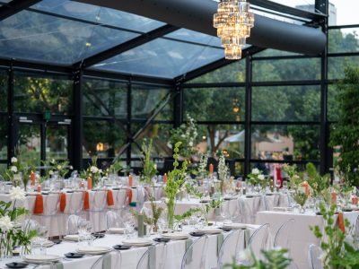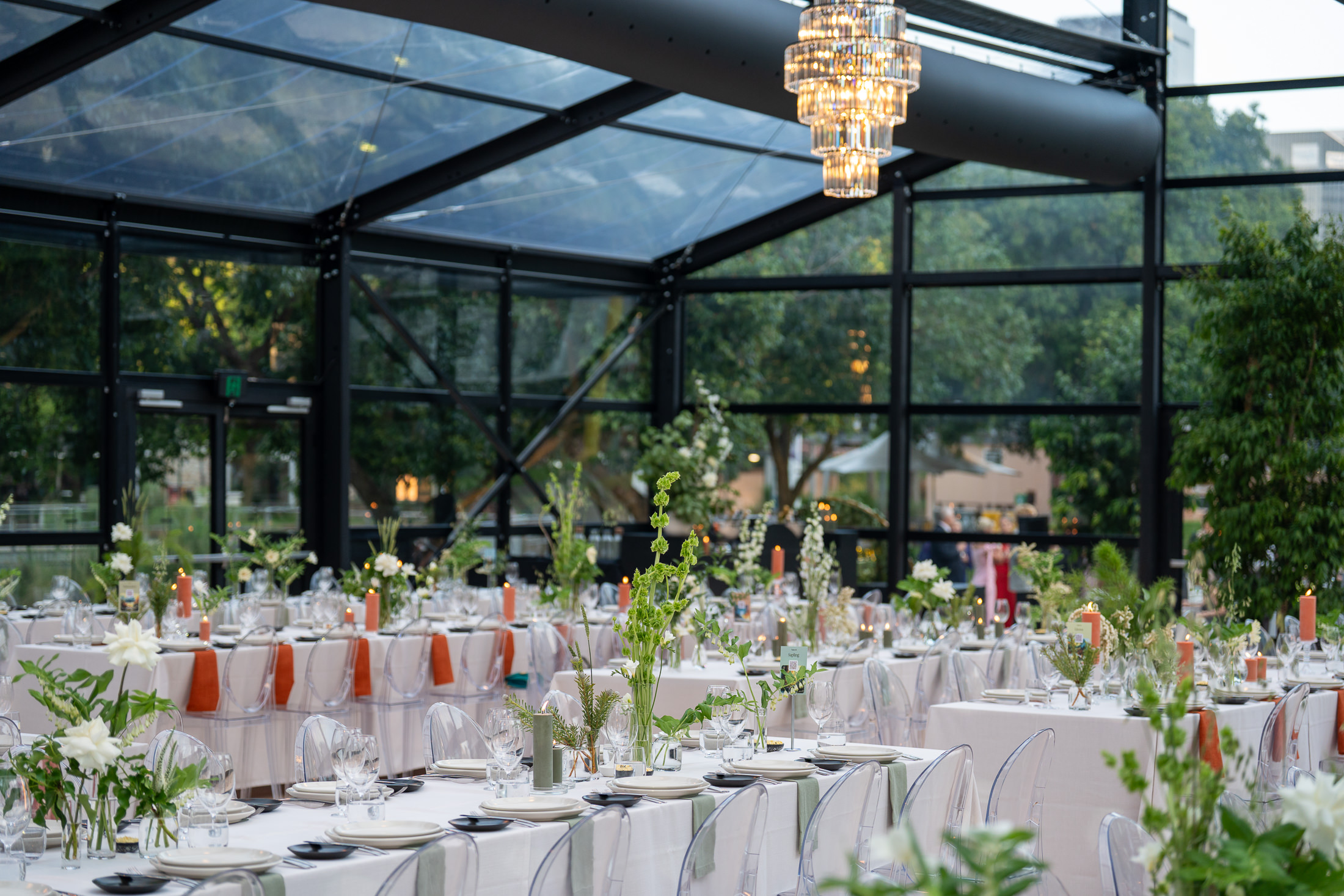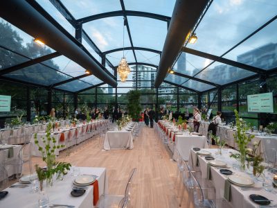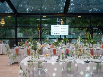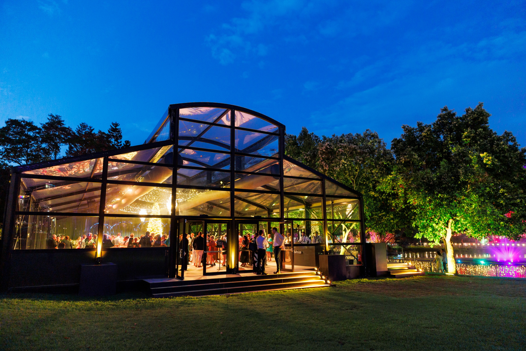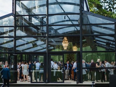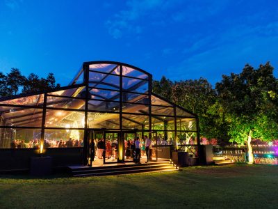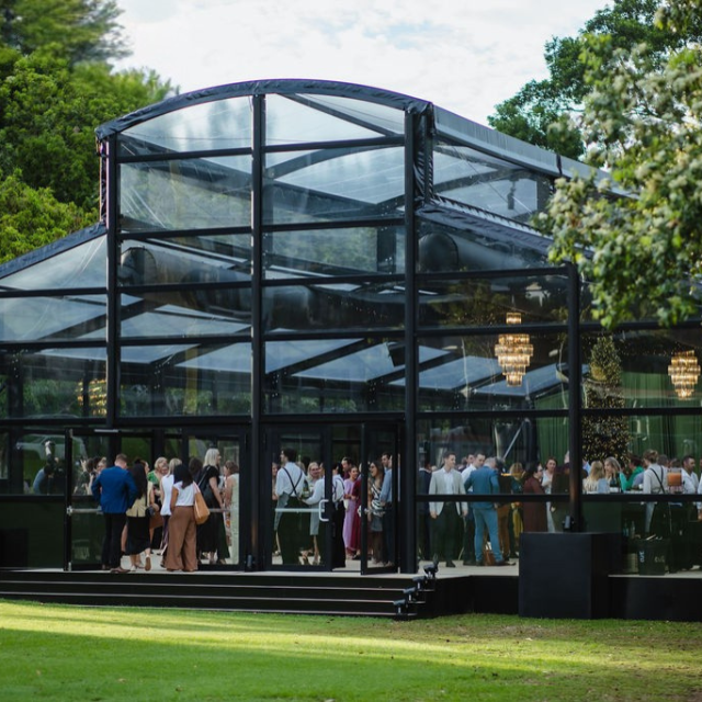 Corporate events at Glo House feel immersive and design-led, set within a striking glass pavilion that blends natural surroundings with high-end production, creating an engaging and memorable atmosphere.