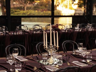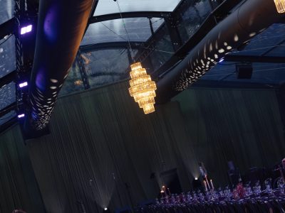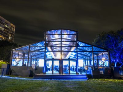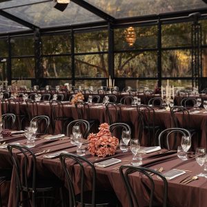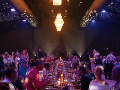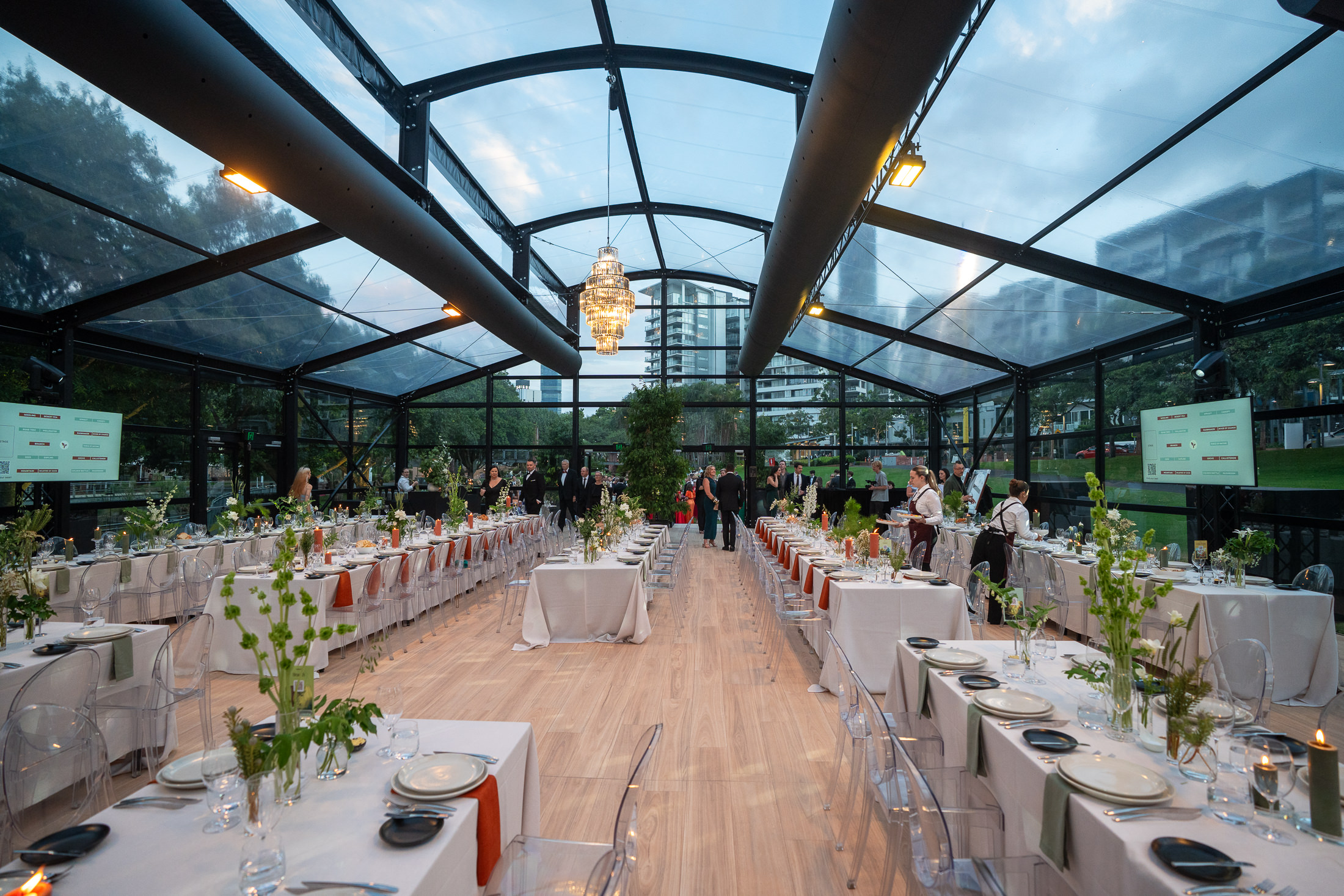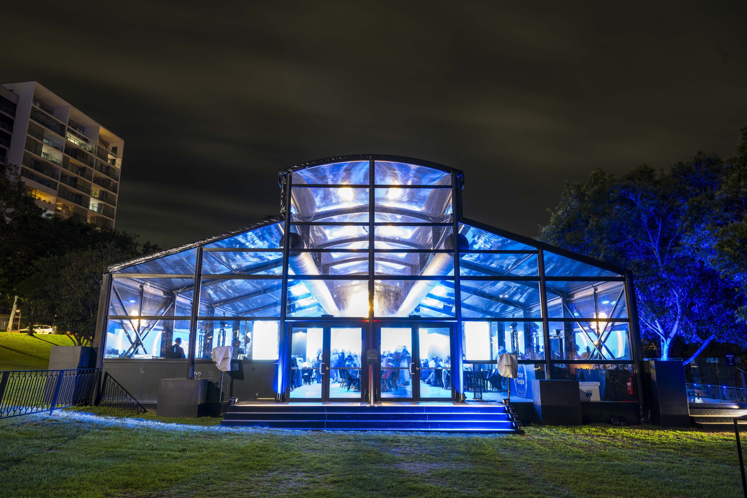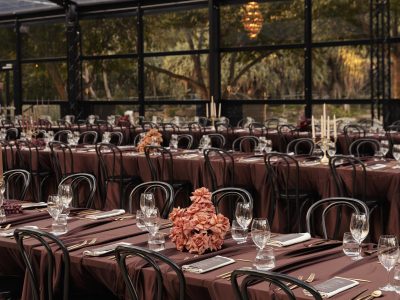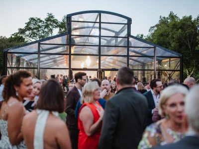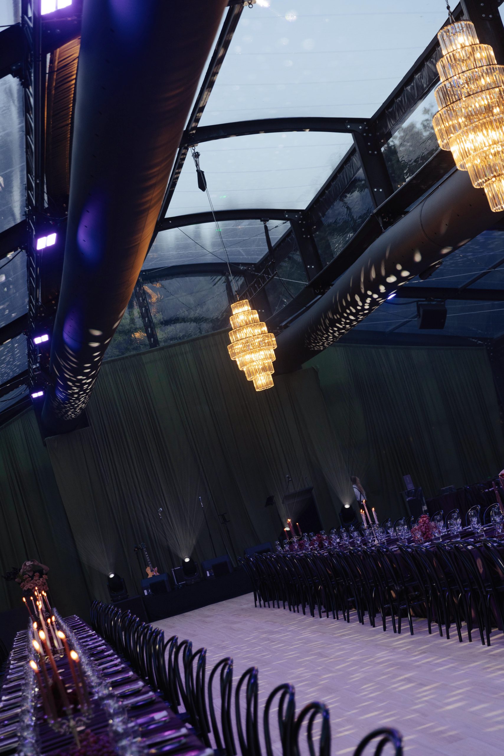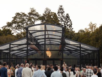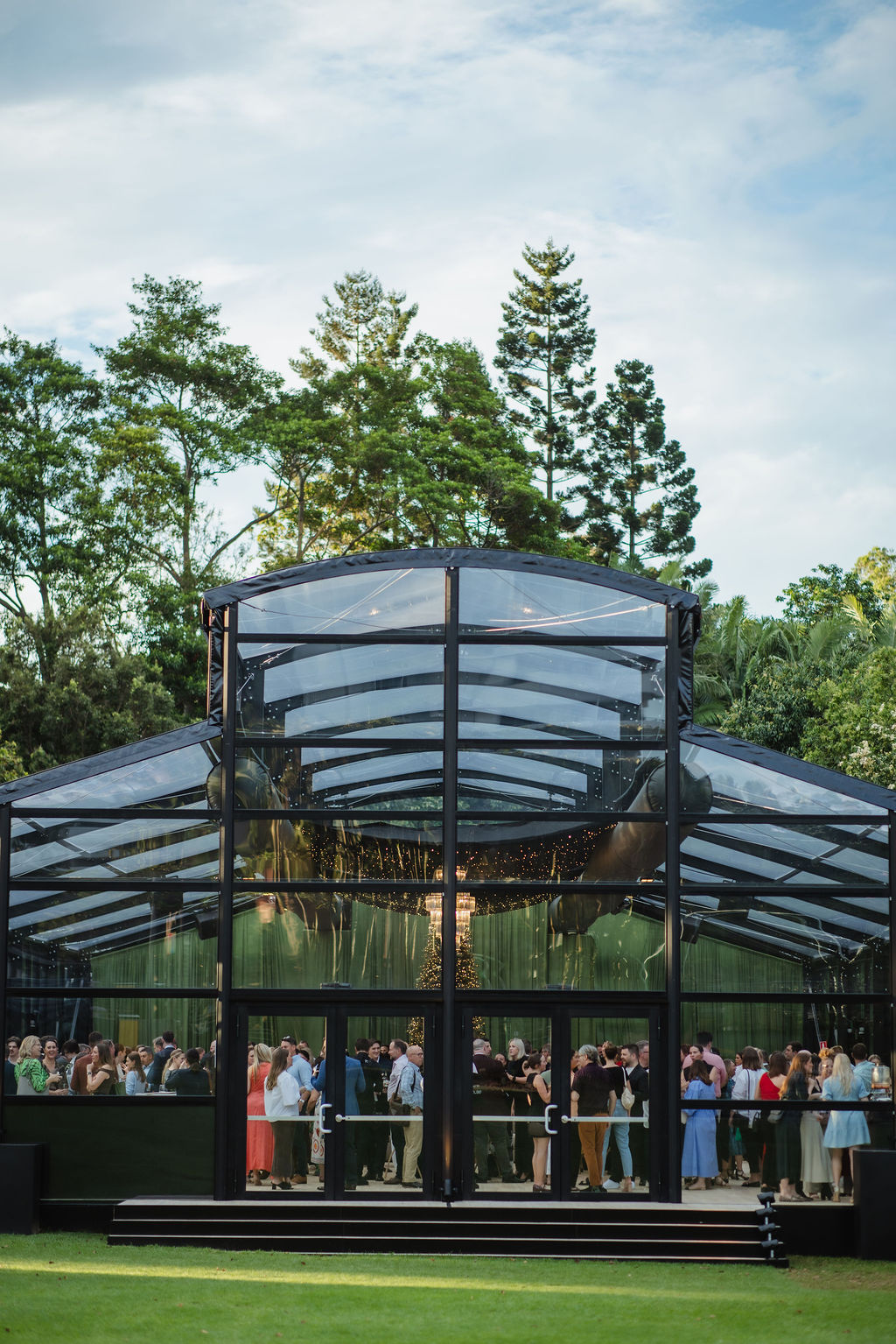 Corporate events at Glo House feel immersive and design-led, set within a striking glass pavilion that blends natural surroundings with high-end production, creating an engaging and memorable atmosphere.