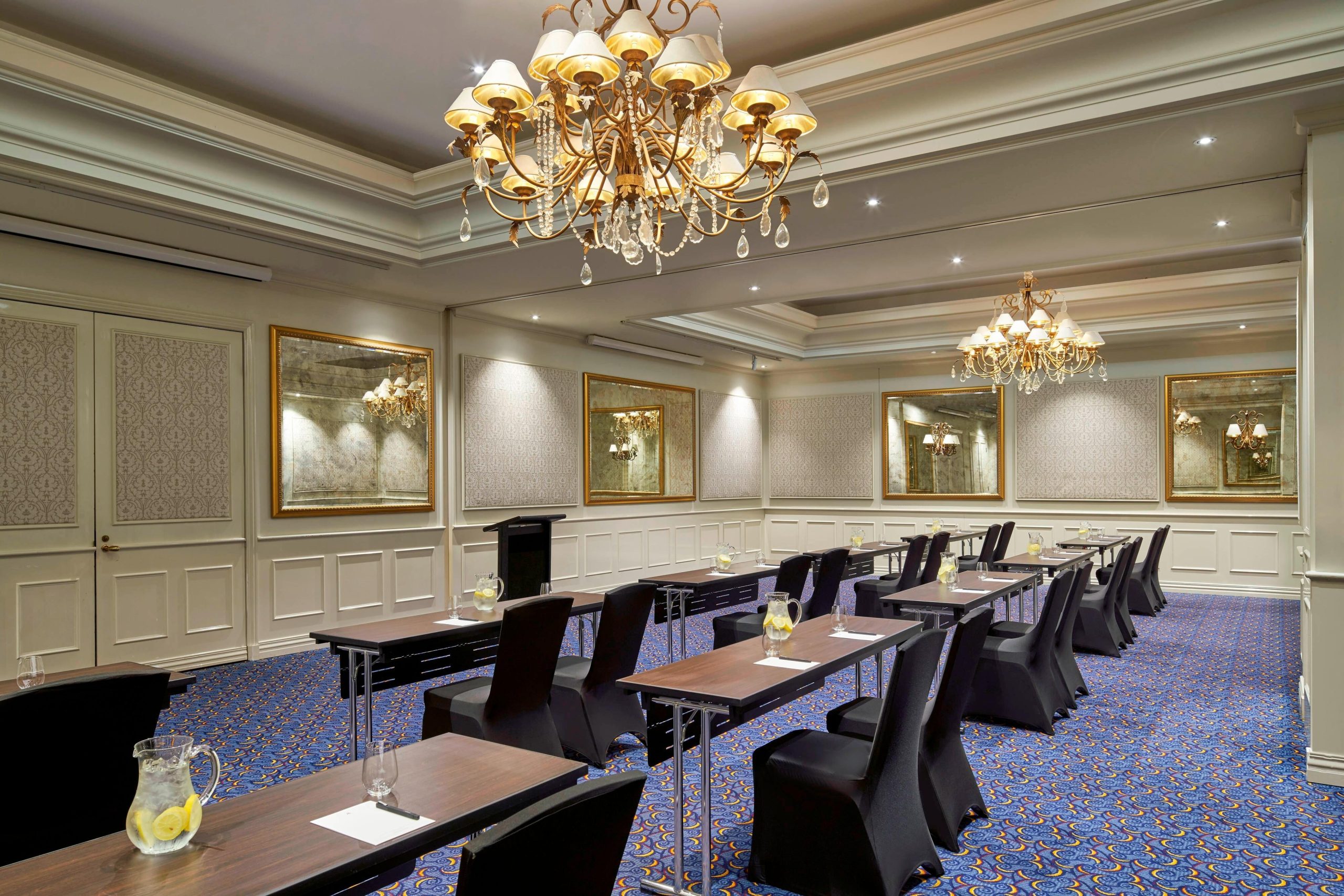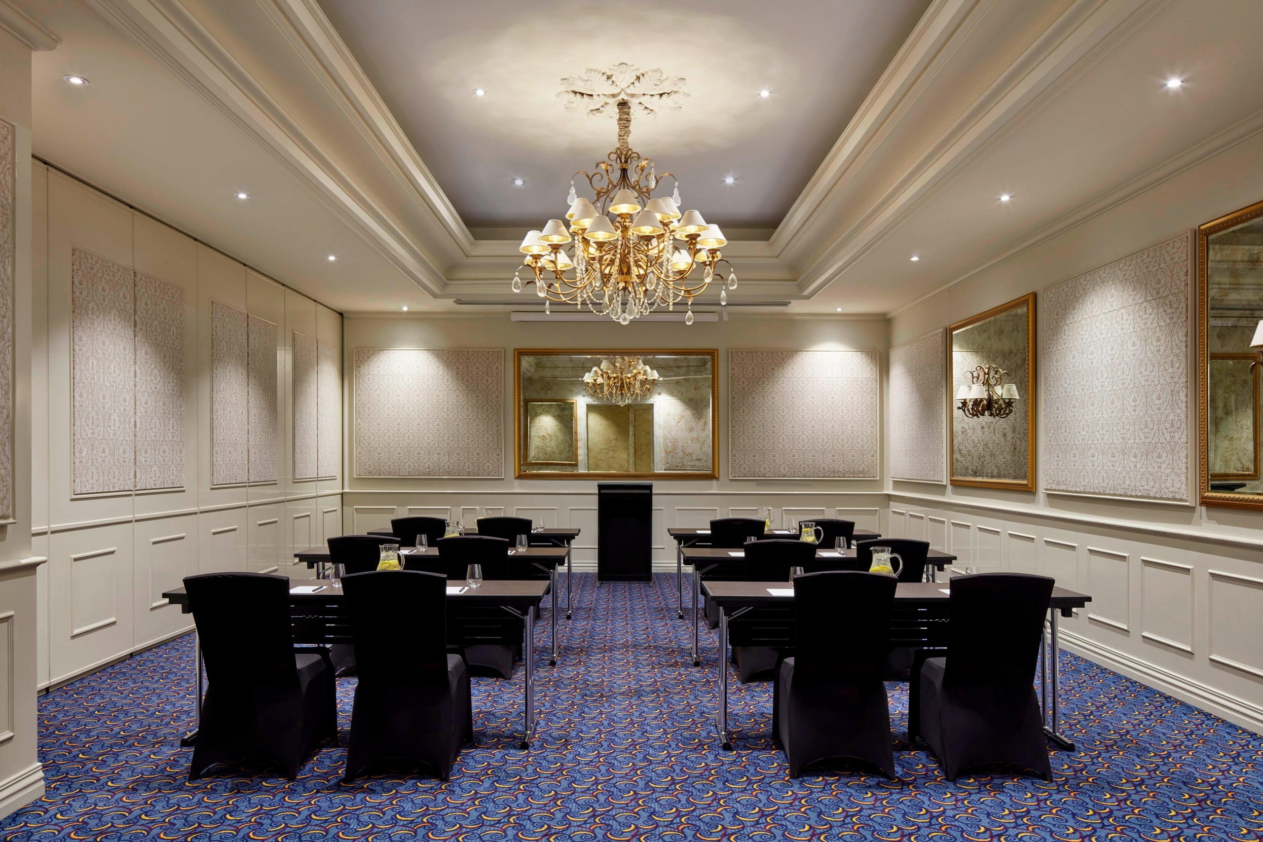 A refined function space with chandeliers and flexible configuration, able to operate as one room or split into two for mid-sized events or breakout sessions.