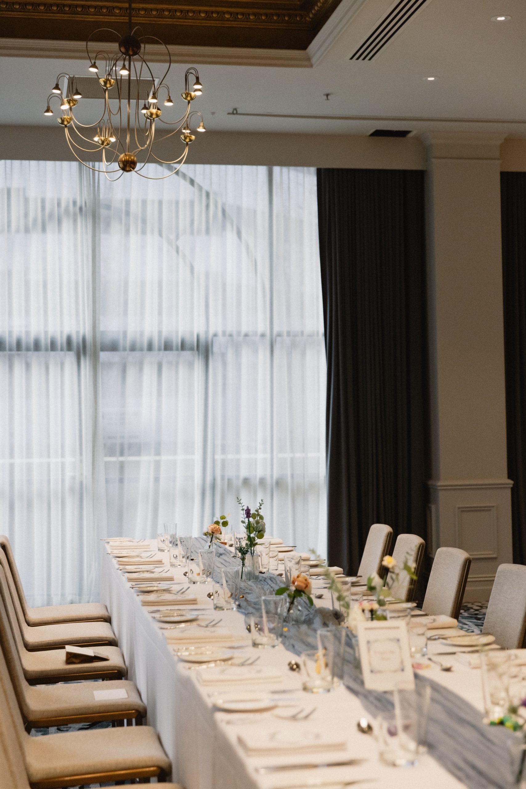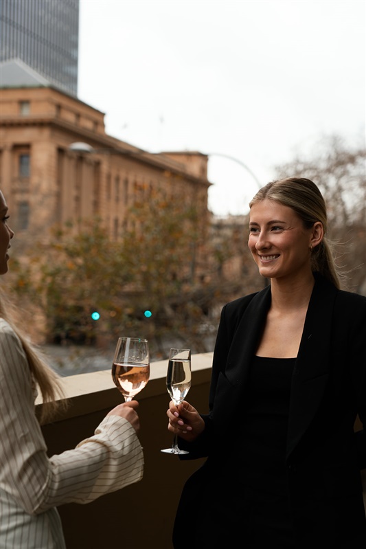 A grand space with floor-to-ceiling windows and balcony views of North Terrace, ideal for large weddings and corporate events.