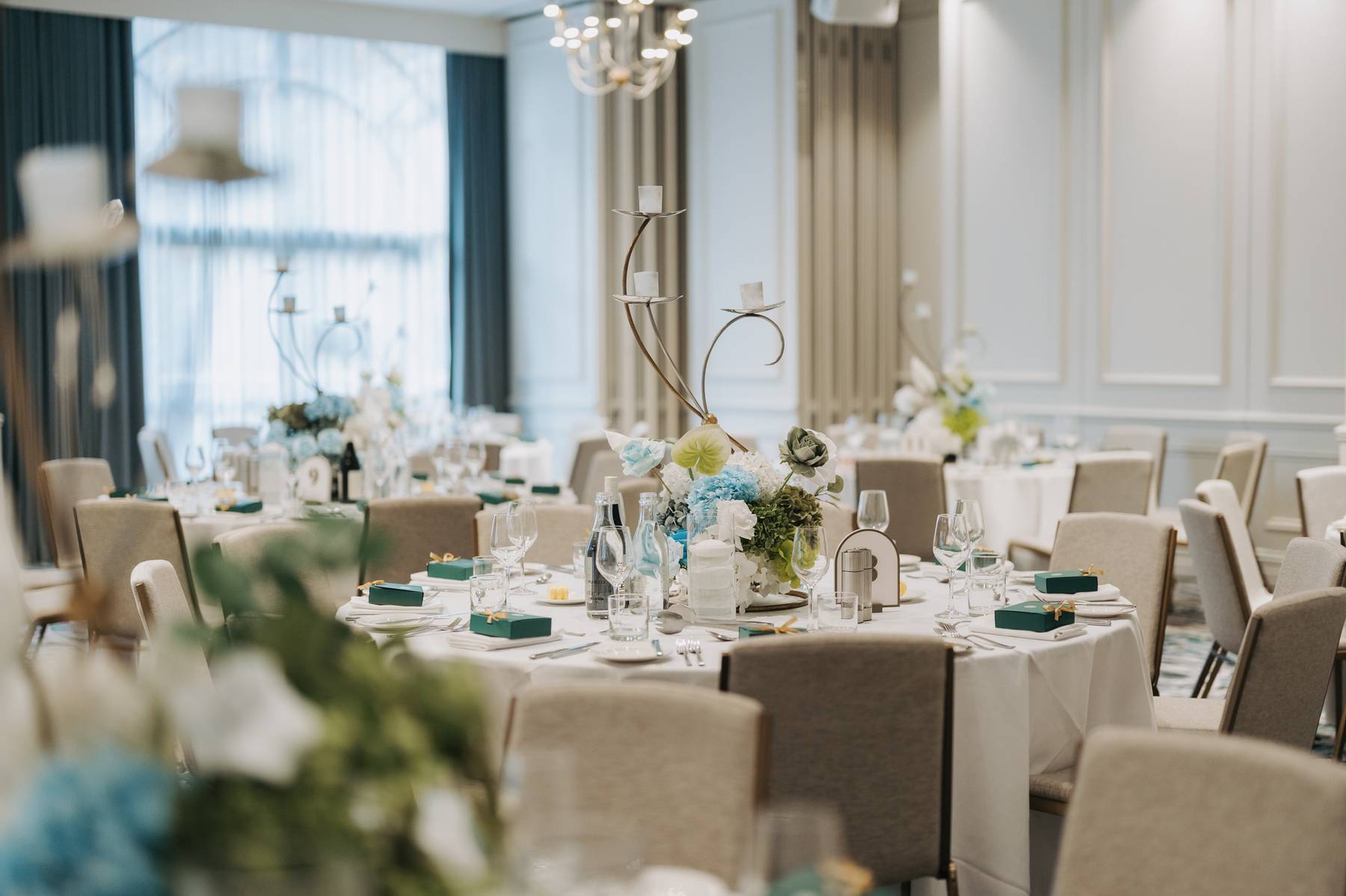Combining two spaces for greater capacity, this setup is ideal for larger events requiring flexibility and sophisticated ambience.