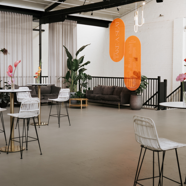 Designed to impress, this spacious area features 8m vaulted ceilings, plenty of natural light, and enough room for seated dining and a generous dancefloor. Make the best use of the space with long timber feasting tables and hanging greenery.