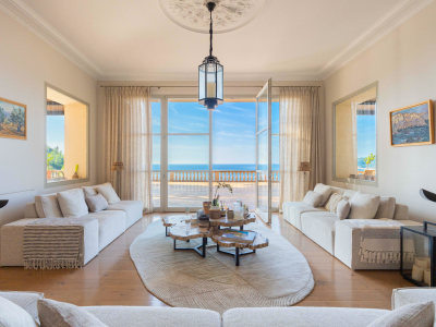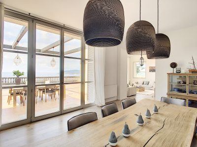 The 400m2 terrace features a classic balustrade and alfresco setting beneath twin pergolas and lanterns, overlooking the Mediterranean.