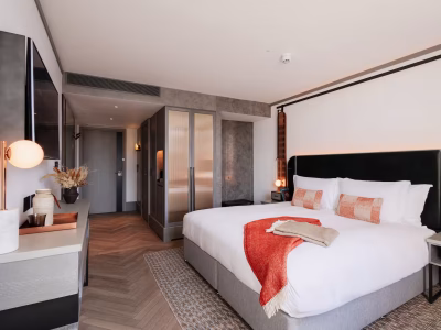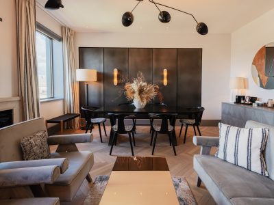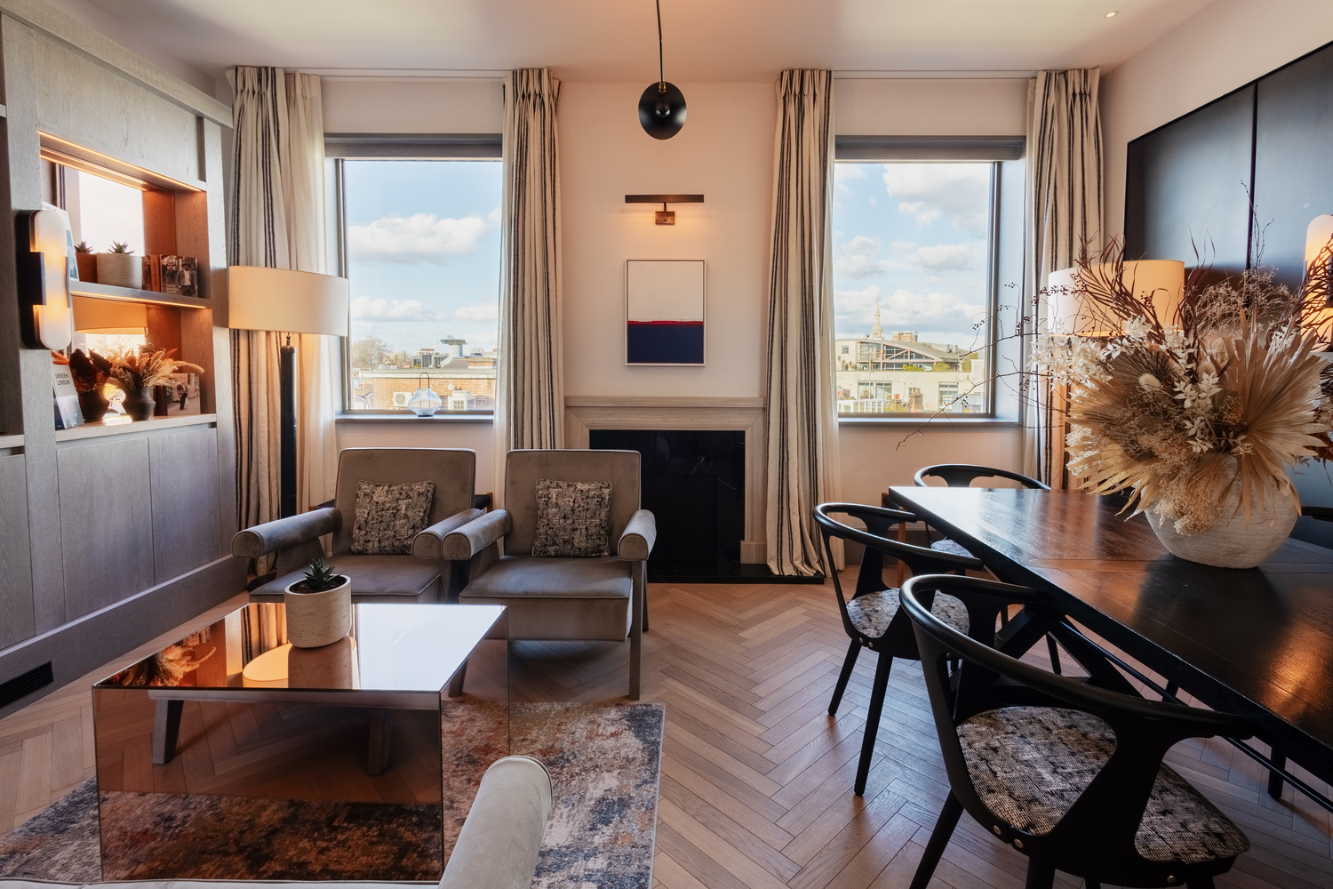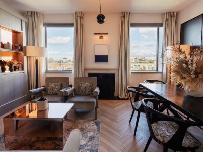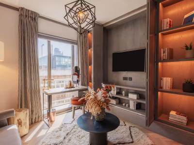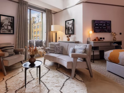 Located on the top floor of Hart Shoreditch, this spacious corner suite offers sweeping views of the iconic London skyline. Ideal for private meetings, intimate gatherings, creative sessions or photoshoots, the suite features a generous living area with comfortable sofas and a dining table for up to six guests. Perfect for working, unwinding, or entertaining, with complimentary Wi-Fi and the privacy of your own space.