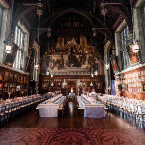 Opened in 1845 by Queen Victoria, the magnificent Great Hall provides the perfect setting for larger weddings, with its striking elevated ceiling, beautiful stained glass windows, rich wooden panelling, and a vast fresco by the renowned British Painter G.F. Watts. For smaller celebrations, many couples gravitate towards the elegant Old Hall — a lovingly maintained Tudor hall that is often considered one of the finest Tudor buildings in London.
