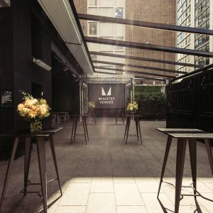 An outdoor space that melds raw architecture with quality lighting and LED branding screens. Ideal for a chill evening of drinks, social breaks, or as an alfresco extension of the main event.