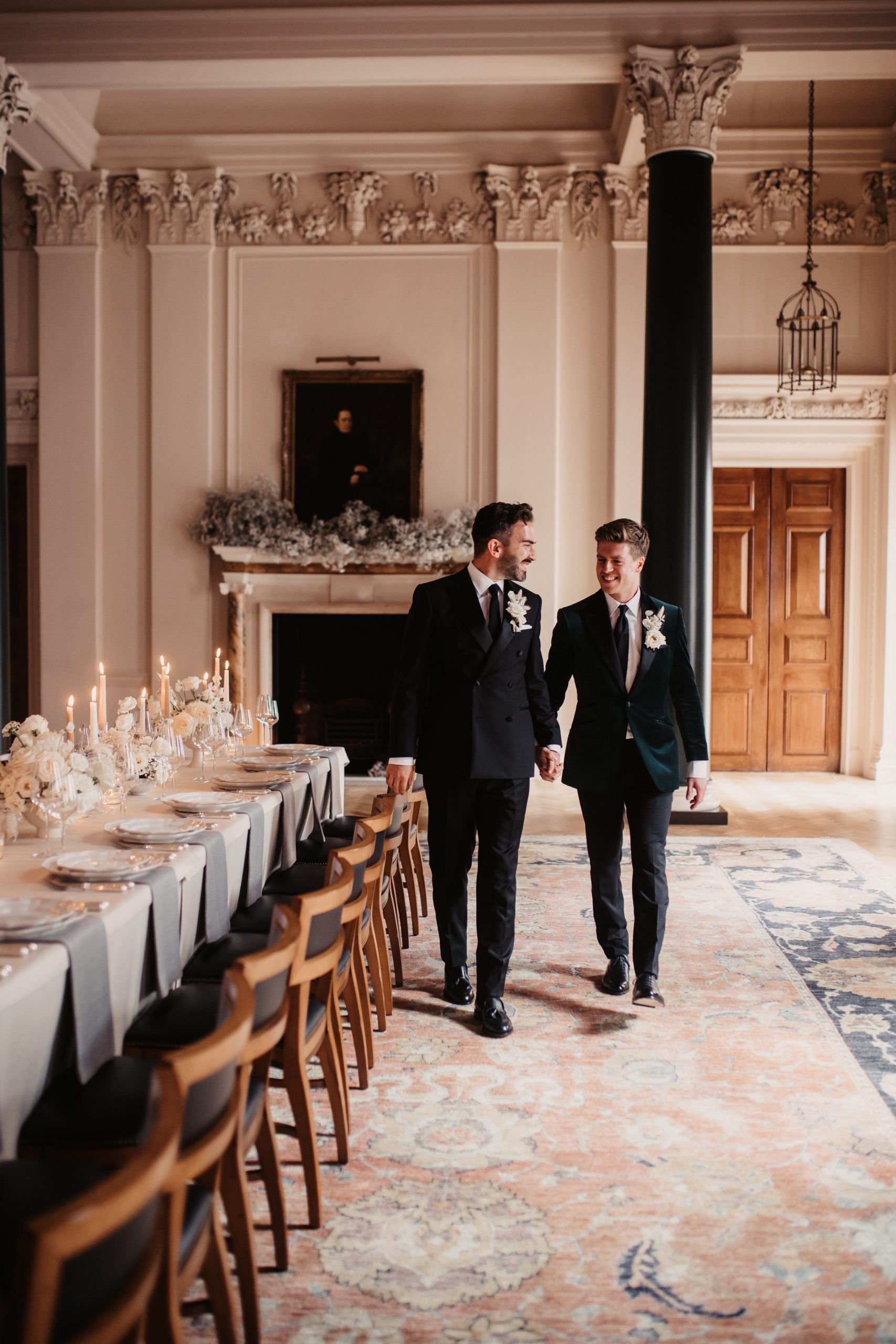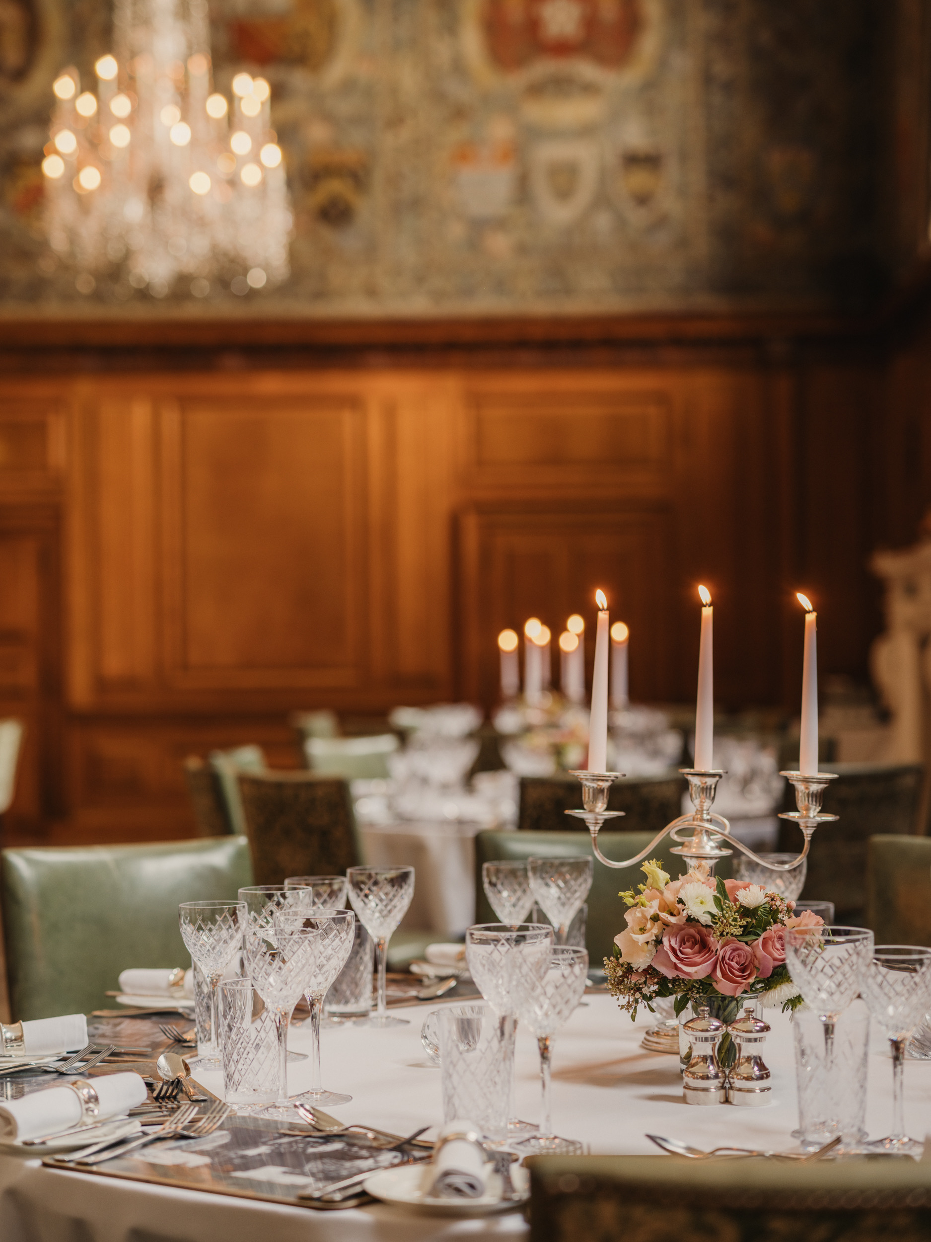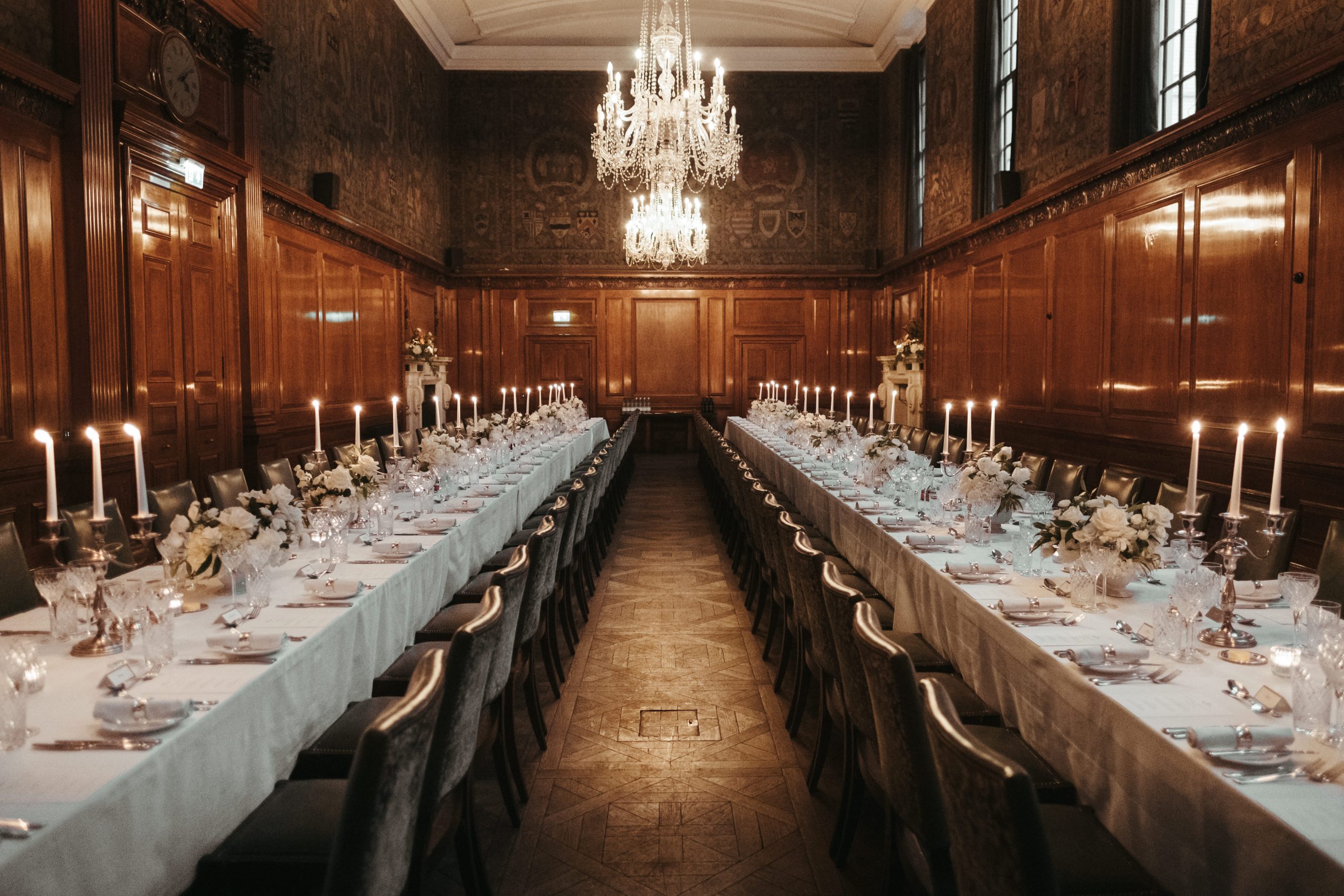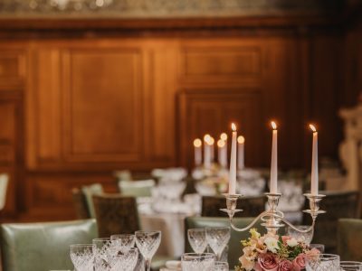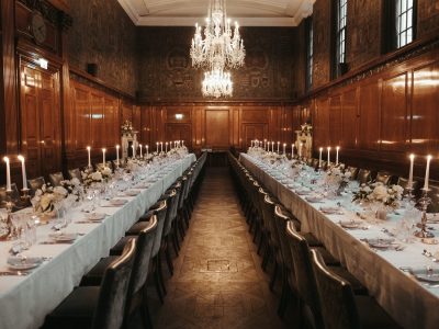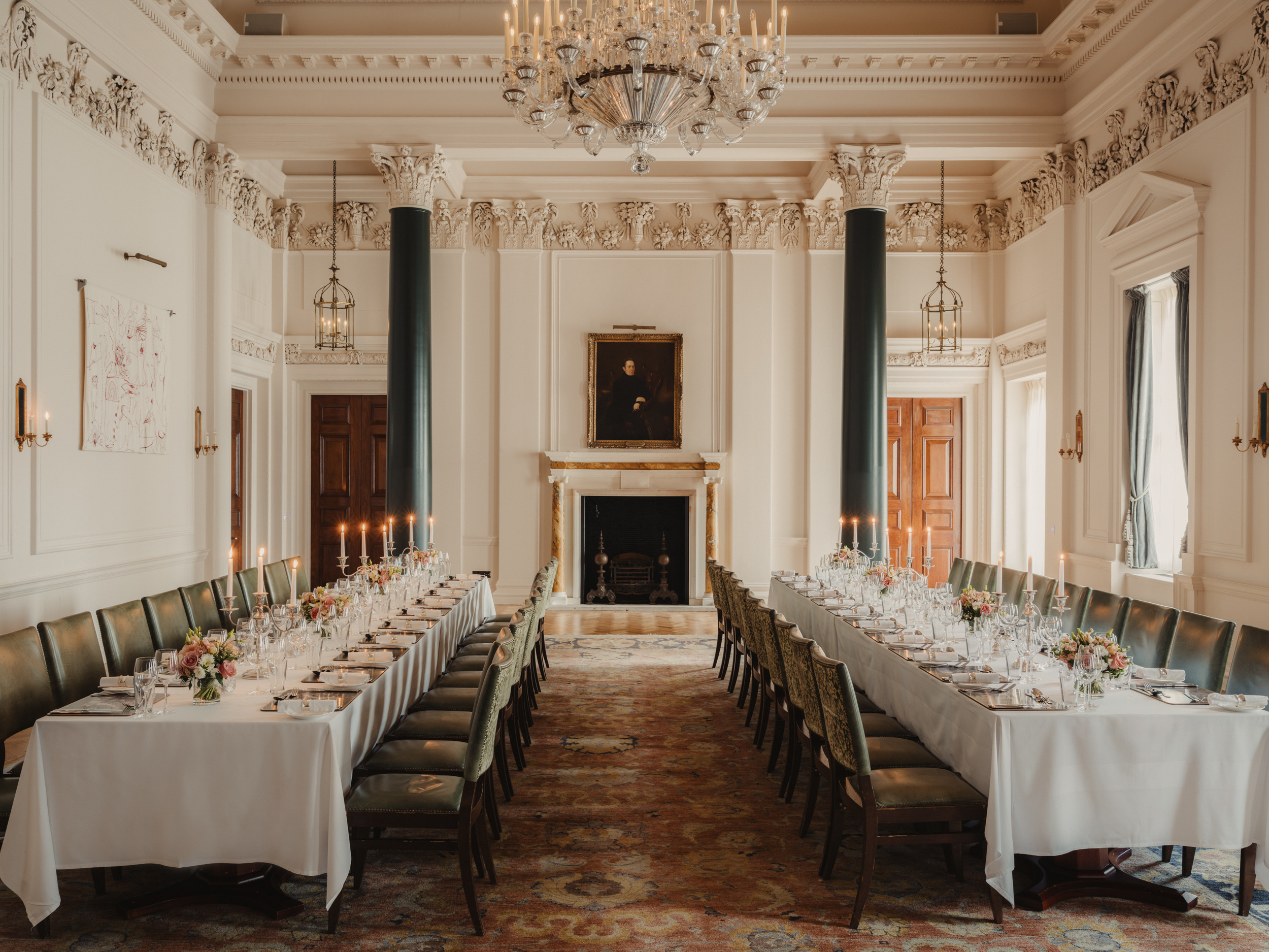 The Saloon evokes the refined charm of the 18th century, with its ornate chalk frieze and a chandelier originally from Devonshire House — an elegant setting for a classic wedding breakfast of up to 70 guests.